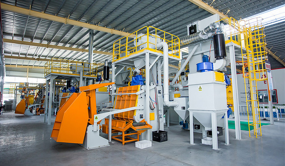 鋼材預處理線專門處理6-200mm鋼板,厚度0-300mm型鋼,鋼材預熱處理后由進料輸送系統送至封閉的拋丸清理室,利用拋丸器高速旋轉的葉輪將鋼丸(鑄鋼丸和鋼絲切...